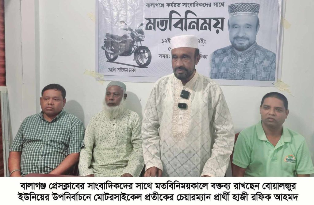 বালাগঞ্জ উপজেলার বোয়ালজুর ইউনিয়ন পরিষদের উপ নির্বাচনের চেয়ারম্যান পদপ্রার্থী হাজী রফিক আহমদ বালাগঞ্জ উপজেলায় কর্মরত সাংবাদিকদের সাথে মতবিনিময় করেছেন। শুক্রবার ১২ জুলাই প্রেসক্লাব কার্যালয়ে মতবিনিময় সভায় তিনি বলেন, দল মত নির্বিশেষে সর্বস্তরের জনতার অনুরোধে আমি চেয়ারম্যান পদে প্রার্থী হয়েছি,কোন নির্দিষ্ট রাজনৈতিক দল বা গোষ্ঠীর প্রার্থী নই। আমি সাধারণ জনতার প্রার্থী। কৃষি ও মৎসনির্ভর ৫ হাজার ২শত ৭২ একর আয়তনের এই ইউনিয়নে বিভিন্ন সম্প্রদায়ের মানুষের সম্প্রীতির বন্ধন চির অটুট। শিক্ষা প্রতিষ্ঠান, নদী-খাল ও হাওর-বাওরে সমৃদ্ধ এই এলাকা। এই ইউনিয়নের অসমাপ্ত উন্নয়ন কাজ সমাপ্ত করে অত্যাধুনিক ইউনিয়ন বিনির্মাণ এবং স্বনির্ভর ও সমৃদ্ধ ইউনিয়ন গড়ার স্বপ্ন নিয়ে আমি মোটরসাইকেল প্রতীক নিয়ে প্রার্থী হয়েছি।