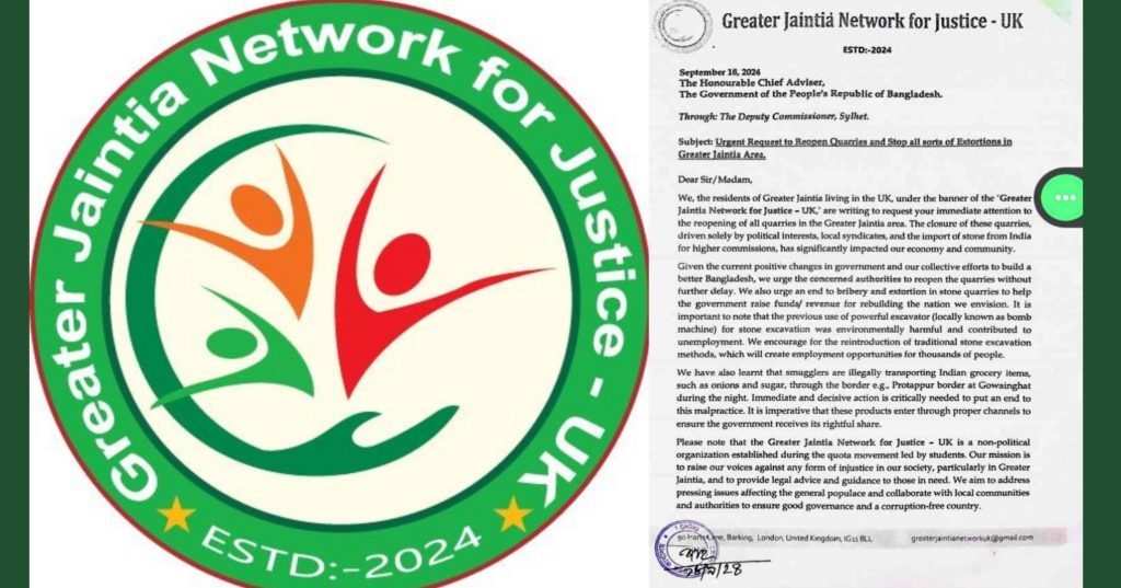 শুধুমাত্র রাজনৈতিক স্বার্থ, স্থানীয় সিন্ডিকেট এবং উচ্চ কমিশনের জন্য ভারত থেকে পাথর আমদানির কারণে কোয়ারিগুলি বন্ধ করে দেশের অর্থনীতিতে ক্ষতিগ্রস্থ করা হচ্ছে। যুক্তরাজ্যে বসবাসরত বৃহত্তর জৈন্তিয়ার বাসিন্দারা, ‘গ্রেটার জৈন্তিয়া নেটওয়ার্ক ফর জাস্টিস – ইউকে’-এর ব্যানারে, বৃহত্তর জৈন্তিয়া এলাকার সমস্ত কোয়ারিগুলি পুনরায় চালু করার জন্য প্রধান উপদেষ্টার দৃষ্টি আকর্ষণ করা হয় স্মরকলিপিতে।