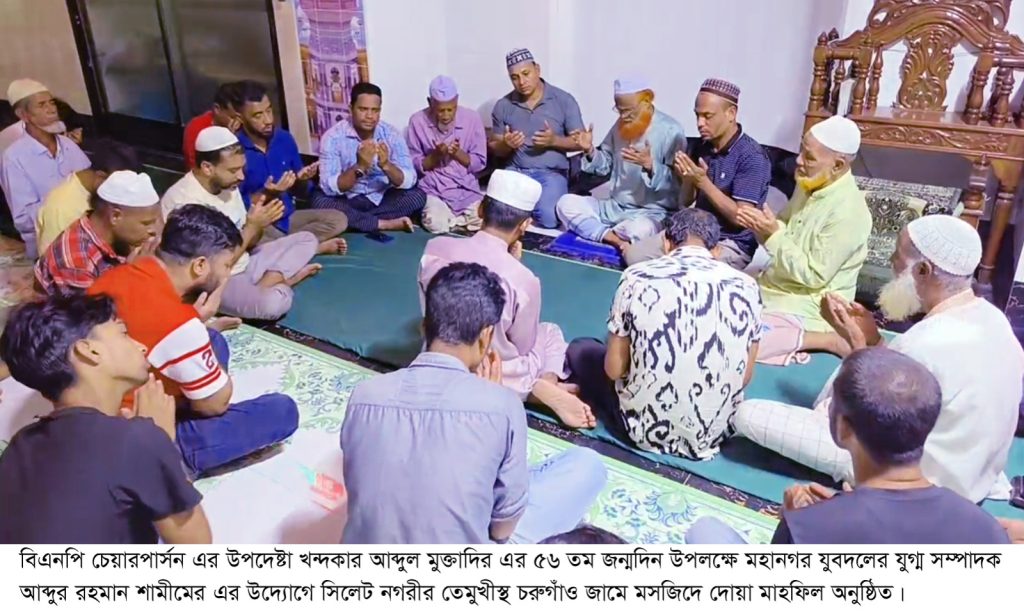 বুধবার (২৫ সেপ্টেম্বর) বাদ আসর সিলেট নগরীর তেমুখীস্থ চরুগাঁও জামে মসজিদে এক দোয়া মাহফিল অনুষ্ঠিত হয়।