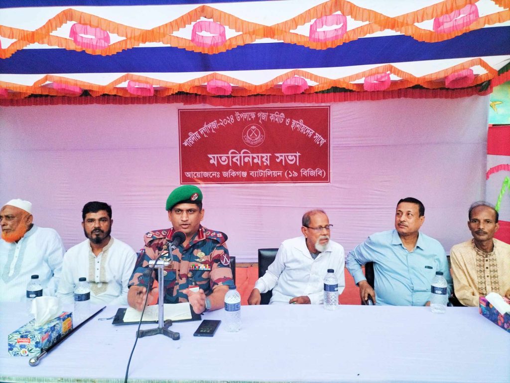 লামনীগ্রাম মডেল সরকারি প্রাথমিক বিদ্যালয় মাঠে মন্দির কমিটির নেতৃবৃন্দ সহ গণ্যমান্য ব্যক্তিদের সাথে মতবিনিময় সভায় জকিগঞ্জ ব্যাটালিয়ান (১৯ বিজিবি)’র অধিনায়ক প্রধান অতিথি লেফটেন্যান্ট কর্ণেল খন্দকার মোঃ আসাদুন্নবি (পিএসসি) বলেন, বিজিবি সদর দফতরের নির্দেশনা মোতাবেক জকিগঞ্জ ব্যাটালিয়ন (১৯ বিজিবি)’ র অধীনে বিভিন্ন পূজা মন্ডপ পরিদর্শন করা হচ্ছে। শারদীয় দুর্গাপূজা উপলক্ষে হিন্দু ধর্মাবলম্বী জনসাধারণের নিরাপত্তা, পূজামন্ডপের নিরাপত্তাসহ সীমান্ত হত্যা, সীমান্ত এলাকায় অবৈধ অনুপ্রবেশসহ চোরাচালান এবং সীমান্ত অপরাধ শূন্যের কোটায় নামিয়ে আনার লক্ষ্যে , বিজিবি মহাপরিচালক (ডিজি)’র নির্দেশ মোতাবেক দেশের সকল সীমান্ত দিয়ে অবৈধভাবে যাতে কেউ সীমান্ত অতিক্রম করতে না পারে সেজন্য নিরাপত্তা ব্যবস্থা জোরদার করা হয়েছে ।