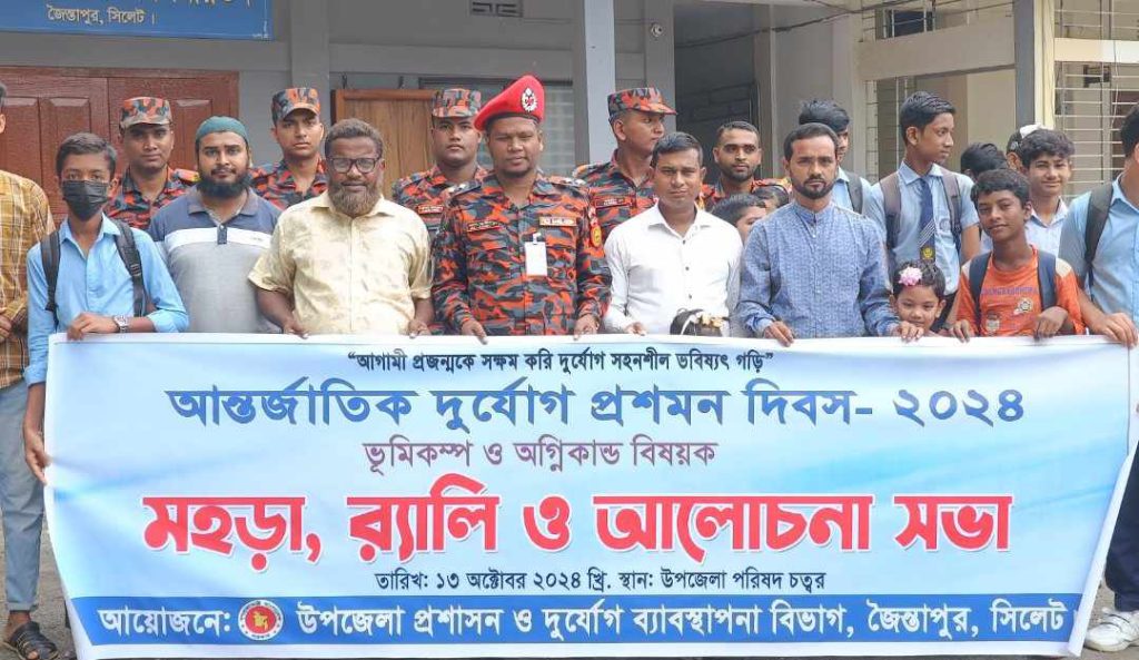 জৈন্তাপুরে আন্তর্জাতিক দুর্যোগ প্রশমন দিবস-২০২৪ উপলক্ষে ভূমিকম্প ও অগ্নিকান্ড বিষয়ক মহড়া, র্যালি ও আলোচনা সভা অনুষ্ঠিত হয়েছে।