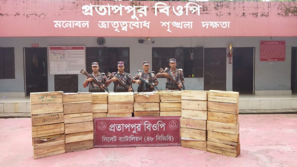 এতে জানানো হয়, গোপন সংবাদের ভিত্তিতে সিলেট ব্যাটালিয়ন (৪৮ বিজিবি)’র আওতাধীন সিলেট ও সুনামগঞ্জ জেলার সীমান্তবর্তী এলাকায় সোম ও মঙ্গলবার অভিযান চালায় বিজিবি। এসময় ৩৬৯ টি ভারতীয় শাড়ী, ৭ টি লেহেঙ্গা, ৪ হাজার ৯৯ পিস সানগ্লাস, ১৬ হাজার ৪০০ কেজি চিনি, -২ হাজার ৮৫০ কেজি আপেল, ৯টি মহিষ, ৪৩টি গরু, ৯৮০ প্যাকেট বিড়ি, ৮৮০ কেজি বাংলাদেশী রসুন, ১টি ডিআই পিকআপ, অবৈধভাবে পাথর উত্তোলনকারী ৭টি নৌকাসহ অন্যান্য মালামাল জব্দ করে।