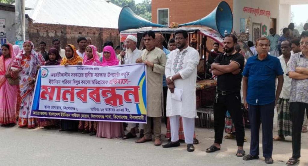 অন্তর্বর্তীকালীণ সরকারের স্থানীয় সরকার উপদেষ্টা কতৃক ইউনিয়দ পরিষদ ভেঙ্গে দেয়া সিদ্ধান্তের প্রতিবাদে মানববন্ধন করেছে নীলফামারীর কিশোরগঞ্জ উপজেলার ৯টি ইউনিয়ন পরিষদের চেয়ারম্যান, ইউপি সদস্য ও মহিলা ভাইস চেয়ারম্যানগণ।