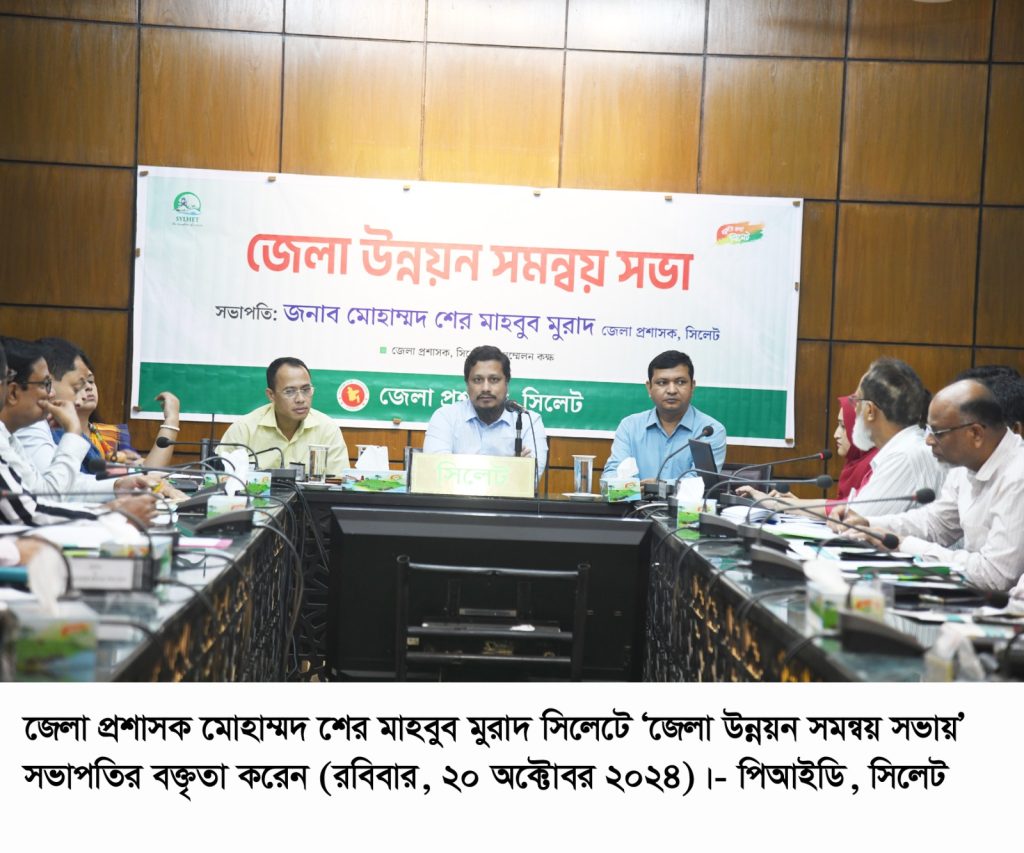 সিলেটে জেলা উন্নয়ন সমন্বয় সভা অনুষ্ঠিত হয়েছে। রবিবার ২০ অক্টোবর জেলা প্রশাসকের কার্যালয়ের সম্মেলন কক্ষে এ সভা অনুষ্ঠিত হয়। এতে সভাপতিত্ব করেন জেলা প্রশাসক মোহাম্মদ শের মাহবুব মুরাদ।