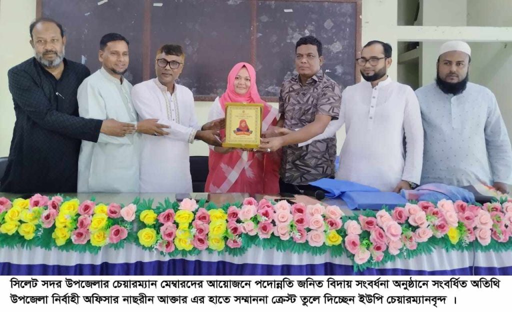 সদর:: সিলেট সদর উপজেলা নির্বাহী অফিসার নাছরীন আক্তারের পদোন্নতি জনিত কারনে বিদায়ী সংবর্ধনা অনুষ্ঠানের আয়োজন করা হয়েছে।
