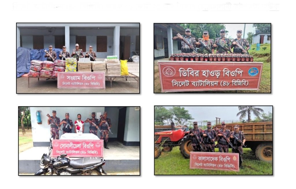 বিজ্ঞপ্তিতে বিজিবি জানায়, গোপন সংবাদের ভিত্তিতে সিলেট ব্যাটালিয়ন (৪৮ বিজিবি)’র আওতাধীন সিলেট ও সুনামগঞ্জ জেলার সীমান্তবর্তী এলাকায় বুধবার ও বৃহস্পতিবার অভিযান চালায় বিজিবি। এসময় ৫৪ পিস লেহেঙ্গা, ২২ পিস ভারতীয় শাড়ী, ২৮ পিস সানগ্লাস, ২ হাজার ১৫৯ পিস সাবান, ৩৭৮ পিস এলোভেরা জেল, ১৯১ বোতল মদ, ১০০ পিস ইয়াবা ট্যাবলেট, মহিন্দ্রা ট্রাক্টর-১ টি, ২ টি মোটরসাইকেল, ৪৯৬ কেজি বাংলাদেশী রসুন এবং অবৈধভাবে পাথর উত্তোলনকারী নৌকা-১১ টিসহ অন্যান্য ভারতীয় পণ্য জব্দ করে। যার আনুমানিক মূল্য ১ কোটি ২০ লাখ ৬৬ হাজার ৩৭০ টাকা।