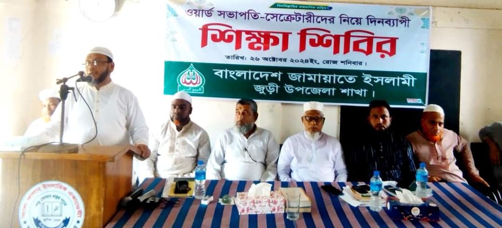 বাংলাদেশ জামায়াতে ইসলামী জুড়ী উপজেলা শাখার উদ্যোগে ওয়ার্ড সভাপতি-সেক্রেটারীদের নিয়ে দিনব্যাপী শিক্ষা শিবির অনুষ্ঠিত হয়েছে। শনিবার (২৬ অক্টোবর) উপজেলা সদরের একটি মিলনায়তনে এ প্রশিক্ষণ কর্মশালা অনুষ্ঠিত হয়।