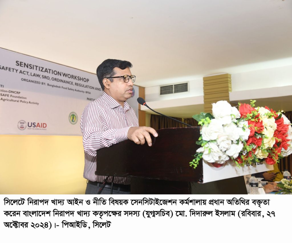 বাংলাদেশ নিরাপদ খাদ্য কতৃপক্ষের আয়োজনে সিলেট নগরের একটি হোটেলে নিরাপদ খাদ্য আইন ও নীতি বিষয়ক সেনসিটাইজেশন কর্মশালা অনুষ্ঠিত হয়েছে। প্রধান অতিথি হিসেবে কর্মশালাটি উদ্বোধন করেন বাংলাদেশ নিরাপদ খাদ্য কতৃপক্ষের সদস্য (খাদ্যভোগ ও ভোক্তা অধিকার) যুগ্ম সচিব মো. দিদারুল ইসলাম। আজ রবিবার ২৭ অক্টোবর ফিড দ্যা ফিউচার বাংলাদেশ পলিসি লিঙ্ক এগ্রিকালচারাল পলিসি এ্যাকটিভিটি- বিএসএএফই (Feed the Future Bangladesh Policy LINK Agricultural Policy Activity BSAFE Foundation) এর সহযোগিতায় নিরাপদ খাদ্য সংশ্লিষ্ট আইন ও নীতি বিষয়ক কর্মশালাটি অনুষ্ঠিত হয়।