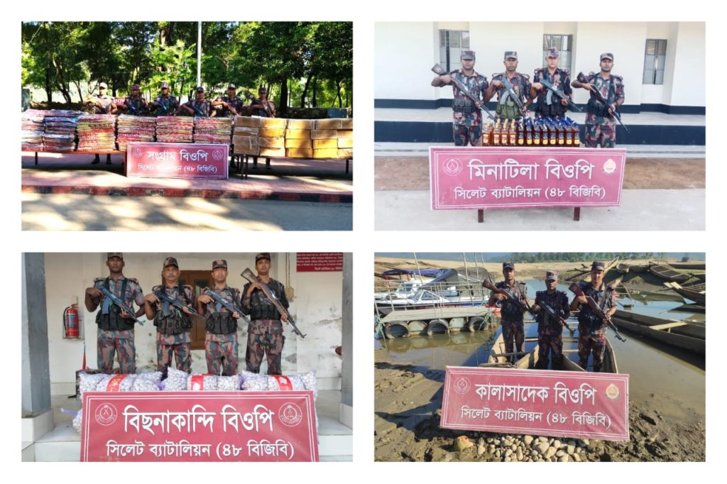 বিজিবি সূত্রে জানা যায়, গত দুই দিনে গোপন সংবাদের ভিত্তিতে সিলেট ব্যাটালিয়ন (৪৮ বিজিবি) এর দায়িত্বাধীন সিলেট এবং সুনামগঞ্জ জেলার সীমান্তবর্তী এলাকায় অভিযান পরিচালনা করে ভারতীয় শাড়ী, কাশ্মীরি শাল, ক্লপ জি ক্রিম, মাই ফেয়ার ক্রিম, শীতের কম্বল, সাবান, অলিভ ওয়েল, রসুন, মদ, বিয়ার, বিড়ি এবং অবৈধভাবে পাথর উত্তোলনকারী নৌকাসহ অন্যান্য ভারতীয় পণ্য আটক করে। যার আনুমানিক ১ কোটি ৪১ লক্ষ ৬২ হাজার ১৭০ টাকা।