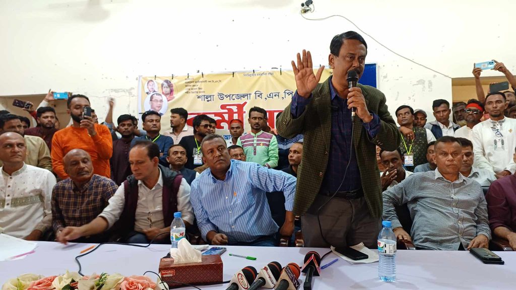 ২৫ নভেম্বর সোমবার শাল্লা উপজেলা পরিষদ গণমিলনায়তনে আহ্বায়ক কমিটি গঠনের লক্ষ্যে শাল্লা উপজেলা বিএনপি ও সহযোগী সংগঠন আয়োজিত কর্মীসভায় সভাপতির বক্তৃতায় দেশনেত্রী বেগম খালেদা জিয়া ও তারেক রহমানের হাতকে শক্তিশালী করার লক্ষ্যে সকল মতভেদ ভুলে জাতীয়তাবাদী শক্তিকে ঐক্যবদ্ধ রাখতে কাঁধে কাঁধ মিলিয়ে কাজ করার আহ্বান জানিয়ে তিনি বলেন শাল্লায় জাতীয়তাবাদী শক্তি সত্যিই ঐক্যবদ্ধ।