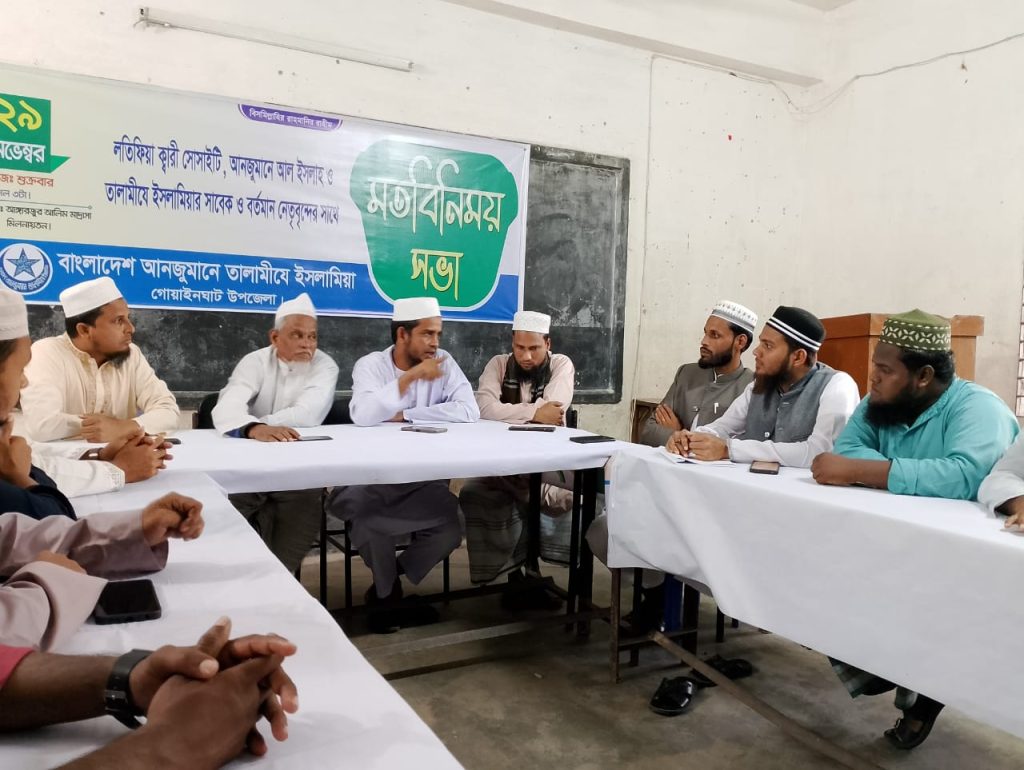 বাংলাদেশ আনজুমানে তালামীযে ইসলামিয়া গোয়াইনঘাট উপজেলা শাখা আয়োজিত আনজুমানে আল ইসলাহ, লতিফিয়া ক্বারি সোসাইটি ও তালামীযের সাবেক বর্তমান নেতৃবৃন্দের সাথে মতবিনিময় সভা শুক্রবার (২৯ নভেম্বর) আঙ্গারজুর আলিম মাদ্রাসা হলরুমে অনুষ্ঠিত হয়েছে।