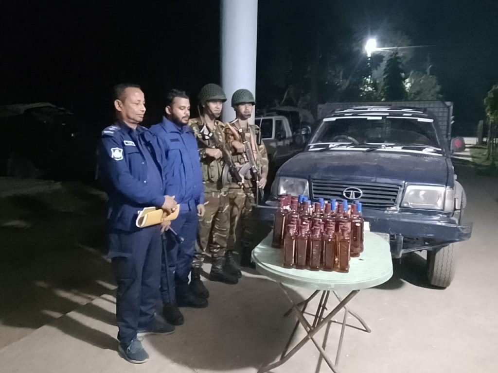 সেনাবাহিনীর সদস্যরা দ্রুত মিনি ট্রাক (ডিআই ট্রাক) তল্লাসী করে প্লাস্টিকের বস্তার ভিতর হতে ৩৭৫ মিলি’র ২০ বোতল Royal Stag, ৭৫০ মিলি’র ১০ বোতল Royal Stag, ৭৫০ মিলি’র ১১ বোতল Imperial Blue এবং ৩৭৫ মিলি’র ২০ বোতল Mc Dowells সহ সর্বমোট ৬১ বোতল মদ উদ্ধার করা হয়।