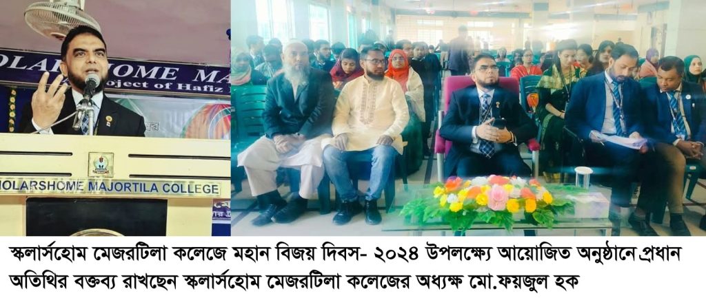 স্কলার্সহোম মেজরটিলা কলেজে মহান বিজয় দিবস- ২০২৪ উপলক্ষ্যে আয়োজিত অনুষ্ঠানে প্রধান অতিথি স্কলার্সহোম মেজরটিলা কলেজের অধ্যক্ষ মো.ফয়জুল হক বলেন,জাতীয় ঐক্যের মধ্য দিয়ে একটি মর্যাদাবান জাতিতে পরিণত হয়ে ,একাত্তরের এই বিজয়কে অর্থবহ করে তুলতে হবে। বাংলাদেশের এই স্বাধীনতা সংগ্রামে একসাগর রক্তের প্রয়োজন হয়েছে, সেই রক্তশোধ করতে হলে, কাঁধে কাঁধ মিলিয়ে আমাদের দেশের উন্নয়নে আন্তরিকতার সাথে কাজ করে যেতে হবে।