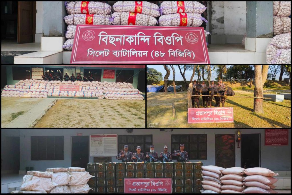 বিজিবি জানায়, রোববার সকালে ৪৮ ব্যাটালিয়নের অধীনস্থ সিলেট এবং সুনামগঞ্জ জেলার সীমান্তবর্তী বাংলাবাজার, লাফার্জ, সোনালীচেলা, নোয়াকোট, সোনারহাট, বিছনাকান্দি, সংগ্রাম, পান্থুমাই, মিনাটিলা, প্রতাপপুর, ডিবিরহাওড় এবং তামাবিল বিওপির জওয়ানরা অভিযান চালিয়ে ভারত থেকে চোরাই পথে আসা বিপুল পরিমাণ সানগ্লাস, চকলেট, গরু, মহিষ, গরুর মাংস, চিনি, কমলা, বিভিন্ন প্রকার ক্রিম, অলিভ অয়েল ও ফুচকা এবং বাংলাদেশ থেকে ভারতে পাচারকালে রসুন ও শিং মাছ জব্দ করে।