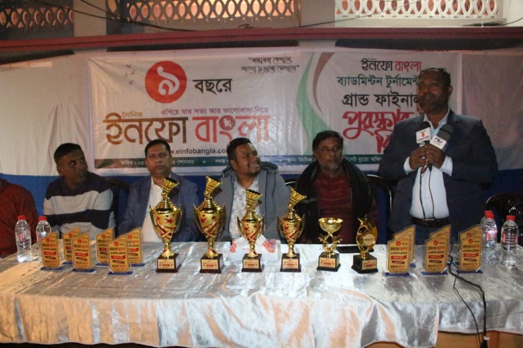 দৈনিক ইনফো বাংলা নবম বছরে পদার্পণ উপলক্ষে দৈনিক ইনফো বাংলা সিলেট ব্যুরো’র উদ্যোগে সোমবার ২৩ ডিসেম্বর সন্ধ্যা ৬ ঘটিকায় সিলেট মহানগরীর শেখঘাটস্থ সিলেট ব্যুরো অফিস প্রাঙ্গণে ব্যাডমিন্টন টুর্নামেন্টের ফাইনাল ও পুরস্কার বিতরণ অনুষ্ঠান সিলেট অনলাইন প্রেস ক্লাবের সভাপতি গুলজার আহমদ হেলাল’র সভাপতিত্বে দৈনিক ইনফো বাংলা ব্যুরো প্রধান উৎফল বড়ুয়া সঞ্চালনায় অনুষ্ঠিত হয়।