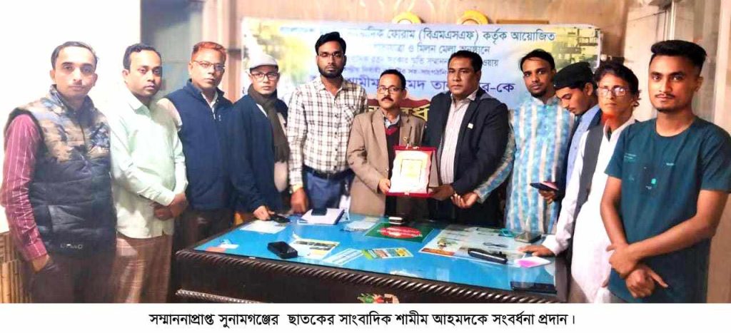 হাওর অধ্যুষিত,জল জোৎ¯œা, কাব্যময়তার নান্দনিক সুনামগঞ্জ জেলার মাটি ও মানুষের পাশে থেকে পেশাদারিত্বের সাথে দেশ ও গণমানুষের কল্যাণে নানা দুর্নীতি, অনিয়ম, সমস্যা এবং সম্ভাবনা নিয়ে সংবাদ প্রকাশ করে সমাজে গুরুত্বপুর্ণ অবদান রাখার স্বীকৃতি হিসাবে, গত রোববার (২২ ডিসেম্বর) ২০২৪ ইং তারিখে সন্ধ্যায় কক্সবাজার সাংস্কৃতিক কেন্দ্রে বাংলাদেশ মফস্বল সাংবাদিক ফোরামের উদ্যোগে চারণ সাংবাদিক রতন সরকার স্মৃতি সম্মাননা পেয়েছেন সুনামগঞ্জের সাংবাদিক শামীম আহমদ তালুকদারসহ সারাদেশ থেকে ৪৫ জন সংবাদকর্মীরা। সাংবাদিক শামীম আহমদ তালুকদার বাংলাদেশ মফস্বল সাংবাদিক ফোরাম (বিএমএসএফ) কেন্দ্রীয় নির্বাহী কমিটির সহ-সাংগঠনিক সম্পাদক।