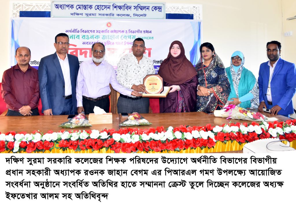 দক্ষিণ সুরমা সরকারি কলেজের অর্থনীতি বিভাগের বিভাগীয় প্রধান সহকারী অধ্যাপক রওনক জাহান বেগম এর পিআরএল গমণ উপলক্ষ্যে সংবর্ধনা প্রদান করা হয়েছে। দক্ষিণ সুরমা সরকারি কলেজ শিক্ষক পরিষদের উদ্যোগে সোমবার (৬ জানুয়ারি) কলেজ পাঙ্গণে এ সংবর্ধনা অনুষ্ঠানের আয়োজন করা হয়। সংবর্ধনা অনুষ্ঠানে সভাপতিত্ব করেন কলেজের অধ্যক্ষ ইফতেখার আলম। আমন্ত্রিত অতিথির বক্তব্য রাখেন কলেজের প্রাক্তন অধ্যক্ষ প্রফসর মো. মছব্বির চৌধুরী।