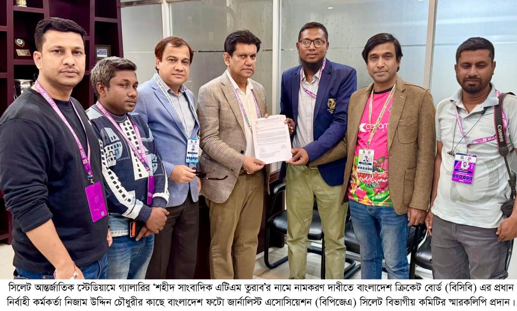 সিলেট আন্তর্জাতিক ক্রিকেট স্টেডিয়ামে ‘শহীদ সাংবাদিক এটিএম তুরাব’র নামে গ্যালারির নামকরণ দাবীতে বাংলাদেশ ক্রিকেট বোর্ড (বিসিবি) এর সভাপতি কাছে স্মারকলিপি প্রদান করেছেন বাংলাদেশ ফটো জার্নালিস্ট এসোসিয়েশন (বিপিজেএ) সিলেট বিভাগীয় কমিটির নেতৃবৃন্দ।