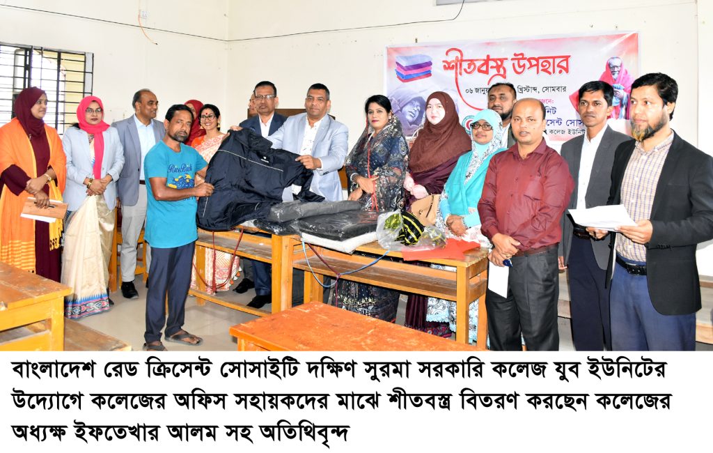 বাংলাদেশ রেড ক্রিসেন্ট সোসাইটি যুব ইউনিট দক্ষিণ সুরমা সরকারি কলেজ ইউনিটের উদ্যোগে শীতবস্ত্র বিতরণ করা হয়েছে। সোমবার (৬ জানুয়ারি) কলেজের অফিস সহায়কদের মাঝে এই শীতবস্ত্র বিতরণ করা হয়।