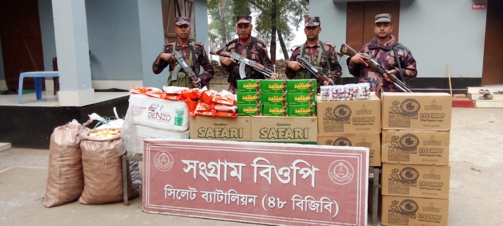 বিজিবি অধিনায়ক জানান, শুল্ক ফাঁকি দিয়ে মেঘালয় রাজ্য থেকে চোরাচালানের মাধ্যমে বৃহস্পতিবার ভোররাতে থেকে সুনামগঞ্জের বাংলাবাজার, লাফার্জ পাথরকোয়ারি সিলেটের সংগ্রাম,বিছনাকান্দি, শ্রীপুর, সোনারহাট, কালাইরাগ বিওপি নিয়ন্ত্রিত বিওপির পৃথক পৃথক বিজিবি টহলদল এপারে নিয়ে আসার পর চোরাচালানের মালামালগুলো জব্দ করে।
