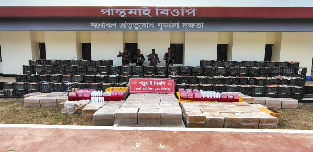 শনিবার দুপুরে বিজিবি এক বিজ্ঞপ্তিতে জানায়, ৪৮ ব্যাটালিয়নের দায়িত্বাধীন সিলেট এবং সুনামগঞ্জ জেলার সীমান্তবর্তী বাংলাবাজার, শ্রীপুর, সোনারহাট, সংগ্রাম, প্রতাপপুর, পান্থুমাই, তামাবিল, নোয়াকোট, কালাসাদেক, কারাইরাগ ও পাথরকোয়ারি বিওপি’র জোয়ানরা অভিযান পরিচালনা করে ভারত থেকে চোরাই পথে আসা বিপুল পরিমাণ ডালিম, কমলা, চিনি, ক্রিম, রিং গার্ড, ফেসওয়াশ, সানগ্লাস, চকলেট, ক্যান্ডি, জিলেট ব্লেড কম্বল এবং বাংলাদেশ থেকে পাচারকালে শিং মাছ জব্দ করেন। এছাড়া অবৈধভাবে পাথর উত্তোলনকারী নৌকা জব্দ করেছে বিজিবি।
