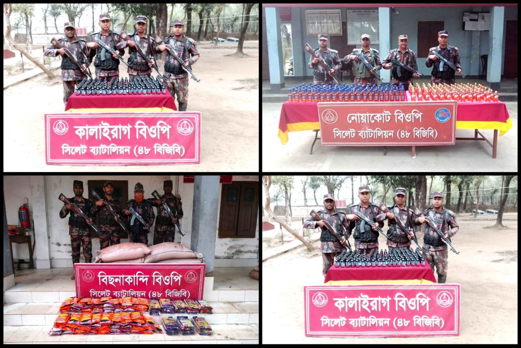 ২৮ জানুয়ারি মঙ্গলবার বিকেলে সিলেট ও সুনামগঞ্জের সীমান্তবর্তী এলাকার প্রতাপপুর, পান্থুমাই, মিনাটিলা, সোনারহাট, বিছনাকান্দি, সংগ্রাম, কালাইরাগ, কালাসাদেক এবং নোয়াকোট বিওপি কর্তৃক অভিযান পরিচালনা করে এসব পণ্য জব্দ করে বিজিবি ৪৮ ব্যাটালিয়ন।