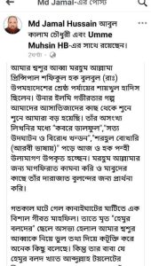 উত্তপ্ত পরিস্থিতে রাতেই জামাল উদ্দিন তার ফেইসবুক আইডিতে দেওয়া স্ট্যাটাস ডিলিট দিয়ে। আরেকটি স্ট্যাটাসে তিনি ভুল শিকার করে ক্ষমা প্রার্থনা করেছেন।
