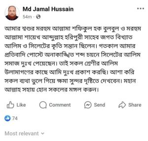 এদিকে সোশ্যাল মিডিয়ায় বিভিন্ন সামাজিক ও রাজনৈতিক নেতৃবৃন্দ বৃহত্তর সিলেটের স্বনামধন্য আলেম শেখ আব্দুল্লাহ ( রহ.) হরিপুরী কে নিয়ে কটুক্তি কর ফেইসবুক স্ট্যাটাস’র তিব্র নিন্দা ও প্রতিবাদ জানিয়েছেন।