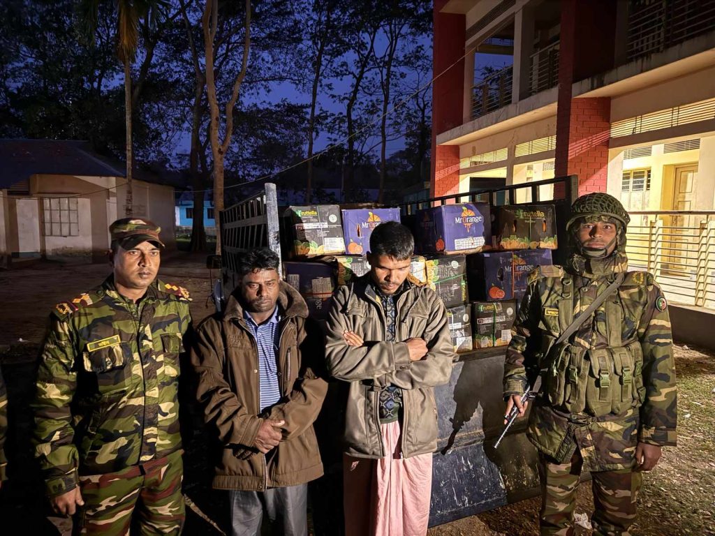 বাংলাদেশ সেনাবাহিনীর ইনফেনট্রি রেজিমেন্ট (২৭ বীর ইউনিট)’র টহলটিমের অভিযানে ২ টি ট্রাক ভর্তি ১২০ বস্তা ভারতীয়  চিনি ও ৬৭ কার্টন ভারতীয় মাল্টা আটক করা হয়েছে। এ ঘটনায় ট্রাকের দুই চালক সহ মোট ৭ জনকে আটক করে পুলিশে হস্তান্তর করেছেন সেনাবাহিনীর টহলটিম।