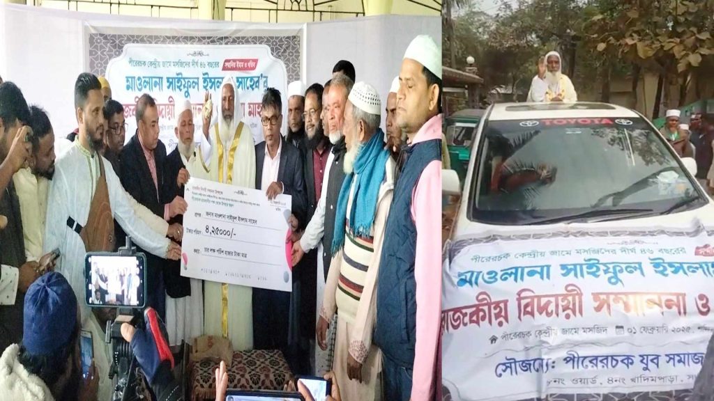 বিদায় অনুষ্ঠানে জামে মসজিদের বিদায়ী ইমাম মাওলানা সাইফুল ইসলামকে নগদ চারলাখ ২৫ হাজার টাকা ও নিত্যব্যবহার্য কিছু সরঞ্জাম তুলে দেন মুসল্লিরা।
