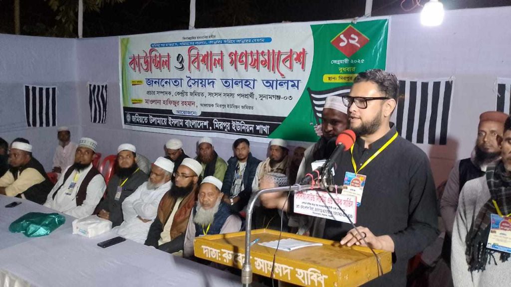 বাংলাদেশ জমিয়তে উলামায়ে ইসলাম কেন্দ্রীয় কমিটির প্রচার সম্পাদক ও আসন্ন জাতীয় সংসদ নির্বাচনে সুনামগঞ্জ-৩ আসনে জমিয়ত মনোনীত সংসদ সদস্য পদপ্রার্থী সৈয়দ তালহা আলম বলেছেন, আমি আপনাদের সন্তান মিরপুর আমার বাড়ি। বিগত উপজেলা নির্বাচনে আমাকে যেভাবে ভালবাসা দিয়েছেন আমি আপনাদের কাছে চিরকৃতজ্ঞ। আগামী জাতীয় সংসদ নির্বাচনে আপনাদের সন্তান হিসেবে আপনাদের খেদমত করার ইচ্ছে পোষণ করছি