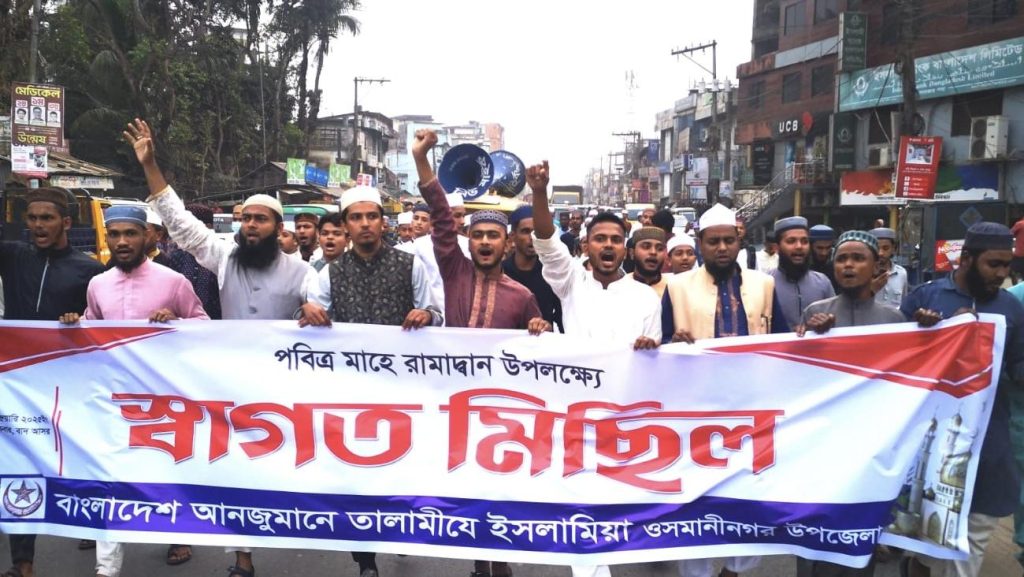 পবিত্র রমজান মাস আগমন উপলক্ষে সিলেটের ওসমানীনগরে আনজুমানে তালামীযে ইসলামিয়ার স্বাগত মিছিল ও পথসভা অনুষ্ঠিত হয়েছে। গতকাল শুক্রবার বিকালে ঢাকা-সিলেট মহাসড়কের গোয়লাবাজার মিছিল পরবর্তী সভায় বক্তারা বলেন, দিনের বেলায় হোটেল রেস্তোরা বন্ধ রাখতে হবে। নিত্য প্রয়োজিনীয় দ্রব্যমূল্য ক্রেতা সাধারণের ক্রয় ক্ষমতার ভিতরে রাখতে হবে। অযতা দাম বড়িয়ে ভোগান্তি সৃষ্টি না করে সিন্টিকেটের বিরুদ্ধে তাৎক্ষণিক ব্যবস্থা নেয়ার দাবী জানান ।