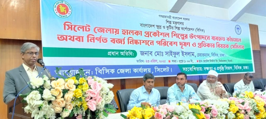 বাংলাদেশ ক্ষুদ্র ও কুটির শিল্প কর্পোরেশনের (বিসিক) চেয়ারম্যান মো. সাইফুল ইসলাম বলেছেন, বিনিয়োগের পরিবেশ উন্নয়নে অনেক অংশীজন রয়েছে। সম্মিলিত প্রয়াসে বিনিয়োগ উন্নয়ন পরিবেশ তৈরি করতে হবে। বিসিক তার অংশের প্রচেষ্টা অব্যাহত রাখবে। বৃহস্পতিবার(২৩ এপ্রিল) বিসিক জেলা কার্যালয়ের আয়োজনে এবং দক্ষতা উন্নয়ন ও প্রযুক্তি বিভাগের সহযোগিতায় নগরের একটি হোটেলে সিলেট জেলা হালকা প্রকৌশল শিল্পের উৎপাদনে ব্যবহৃত কাঁচামাল অথবা নির্গত বর্জ্য নিষ্কাশনে পরিবেশ দূষণ ও প্রতিকার বিষয়ক সেমিনারে তিনি এসব কথা বলেন।