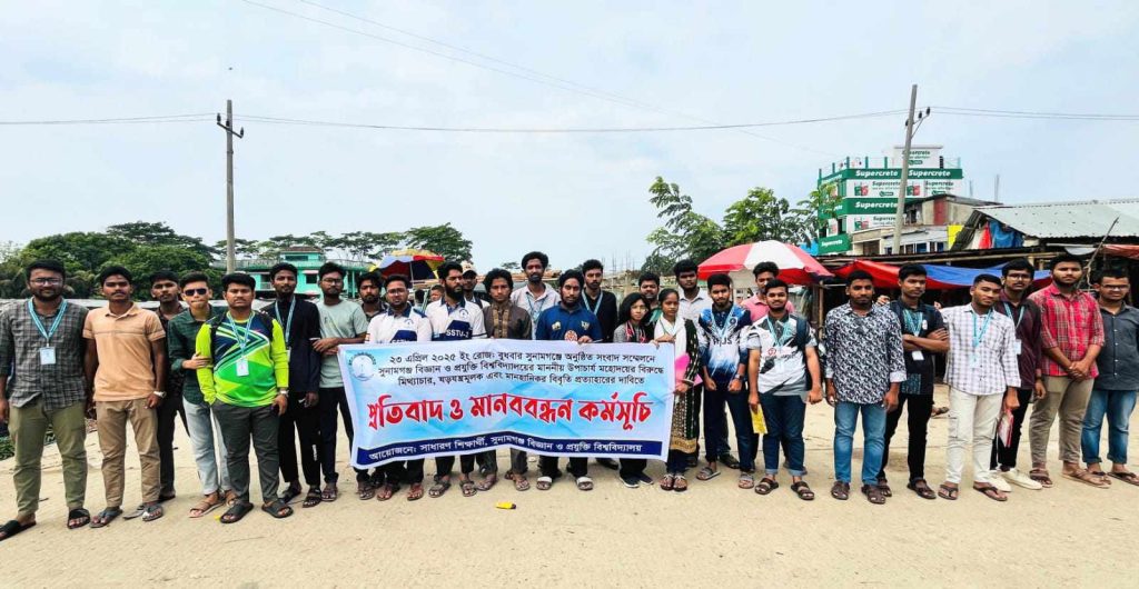 সোমবার(২৮ এপ্রিল) দুপুর ১.৩০ ঘটিকায় শান্তিগঞ্জ বাজার চত্বরে সুনামগঞ্জ বিজ্ঞান ও প্রযুক্তি বিশ্ববিদ্যালয় এর সাধারণ শিক্ষার্থীদের আয়োজনে এই প্রতিবাদ ও মানববন্ধন অনুষ্ঠিত হয়েছে।