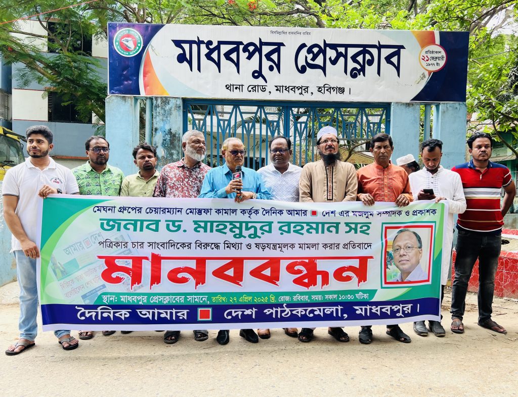 মাধবপুরে আমার দেশের সম্পাদক মাহমুদুর রহমানের বিরুদ্ধে মিথ্যা মামলা প্রত্যাহারের দাবিতে মানববন্ধন