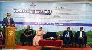 কার্গো ফ্লাইটের উদ্বোধন অনুষ্ঠানে বক্তব্য দিচ্ছেন বেসামরিক বিমান পরিবহন ও পর্যটন মন্ত্রণালয়ের উপদেষ্টা শেখ বশিরউদ্দীন।