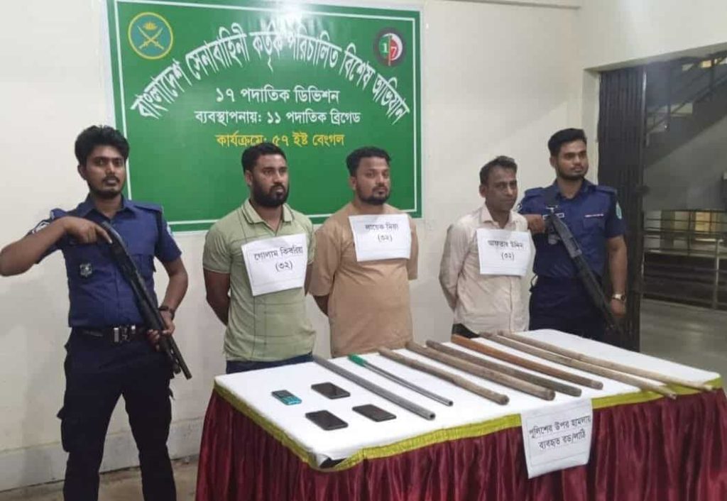 আটকৃতরা হলেন, দক্ষিণ খুরমা ইউনিয়নের জাতুয়া গ্রামের আসমত আলীর পুত্র লায়েক মিয়া,জাতুয়া গ্রামের শামসুল হকের পুত্র মো.গোলাম কিবরিয়া ও গোবিন্দগঞ্জ-সৈদের গাঁও ইউনিয়নের দিঘলী গ্রামের মৃত বশর মিয়ার পুত্র আফতাব উদ্দিন। আটকৃতদের কাছ থেকে দেশীয় অস্ত্র,৪ টি মোবাইল ফোন উদ্ধার করা হয়েছে।