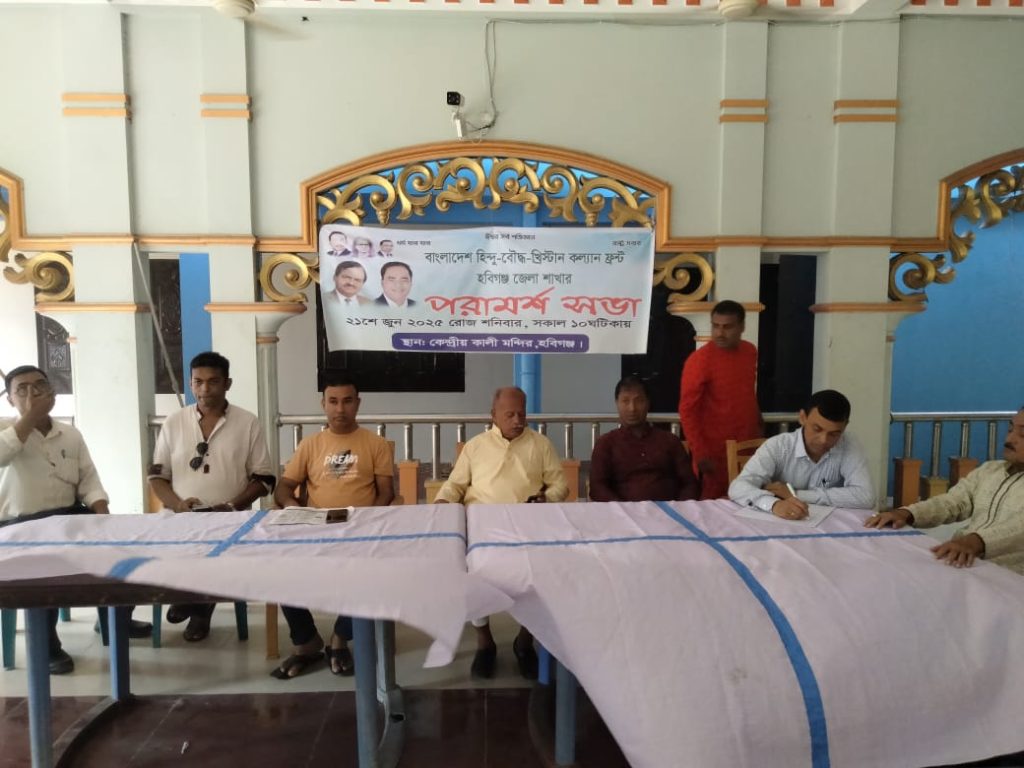হবিগঞ্জে বাংলাদেশ হিন্দু-বৌদ্ধ-খ্রিস্টান কল্যাণ ফ্রন্ট হবিগঞ্জ জেলা শাখার এক পরামর্শ সভা অনুষ্ঠিত হয়েছে। শনিবার (তারিখ দিন) বেলা ১১টায় হবিগঞ্জ শহরের ঐতিহ্যবাহী শ্রীশ্রী কালীনাড়ি প্রাঙ্গণে এই সভা অনুষ্ঠিত হয়।