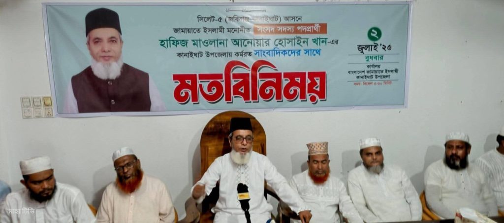 সিলেট ৫ (কানাইঘাট-জকিগঞ্জ) আসনে জাতীয় সংসদ নির্বাচনে জামায়াতে ইসলামীর মনোনীত প্রার্থী হাফিজ মাওলানা আনোয়ার হোসাইন খান কানাইঘাটে কর্মরত সাংবাদিকদের সঙ্গে মতবিনিময় করেছেন।