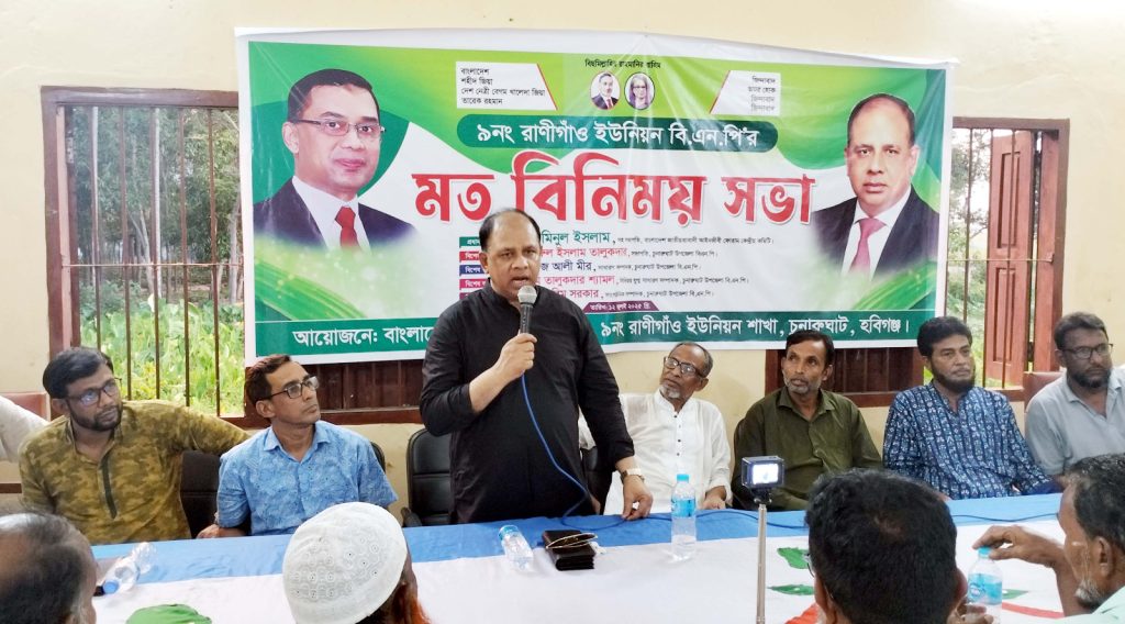 শনিবার (১২ জুলাই) রাতে ইউনিয়ন পরিষদ হলরুমে বাংলাদেশ জাতীয়তাবাদী দল বিএনপি ৯ নং রাণীগাঁও ইউনিয়ন শাখার আয়োজনে মতবিনিময় সভাটি ইউনিয়ন বিএনপির সাধারণ সম্পাদক মোঃ নুরুল আমিনে পরিচালনায় ও ইউনিয়ন বিএনপির সহ-সভাপতি মোঃ উস্তার মিয়ার সভাপতিত্বে সভায় প্রধান অতিথি হিসেবে উপস্থিত থেকে বক্তব্য রাখেন বাংলাদেশ সুপ্রীম কোর্টের আপীল বিভাগের আইনজীবী, বাংলাদেশ জাতীয়তাবাদী আইনজীবী ফোরামের কেন্দ্রীয় কমিটি’র সিনিয়র সহ-সভাপতি, হবিগঞ্জ জেলা বিএনপি’র আহবায়ক কমিটি’র সদস্য ও হবিগঞ্জ-৪ (চুনারুঘাট-মাধবপুর) নির্বাচনী এলাকার সম্ভাব্য সংসদ সদস্য পদপ্রার্থী ও মনোনয়ন প্রত্যাশী- এডভোকেট মোহাম্মদ আমিনুল ইসলাম।