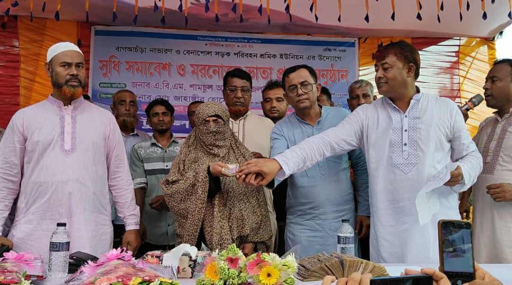বেনাপোল প্রতিনিধি: শার্শার বাগআঁচড়ায় নাভারণ–বেনাপোল সড়ক পরিবহন মটর শ্রমিক ইউনিয়নের উদ্যোগে আয়োজিত এক সুধী সমাবেশ ৩১ জন মৃত পরিবহন শ্রমিকের পরিবারকে আর্থিক সহায়তা প্রদান করা হয়েছে। মরহুমদের স্মরণে আয়োজিত এ ব্যতিক্রমী অনুষ্ঠানে প্রতিটি পরিবারকে ৩৫ হাজার টাকা করে মরণোত্তর ভাতা প্রদান করা হয়।