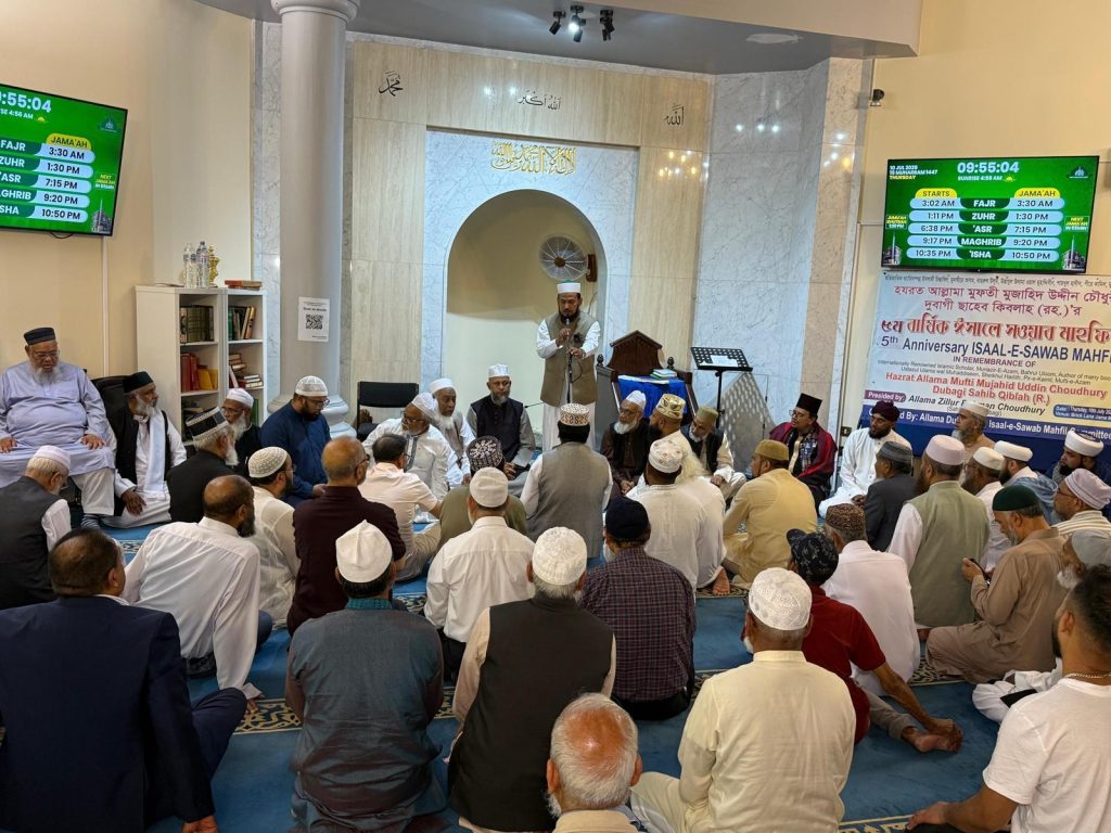 ডেস্ক নিউজ :: বৃটেনে বাংলাদেশী শীর্ষ ওলিয়ে কামিল, প্রখ্যাত বুযুর্গ, ইউকে ওলামা সোসাইটির প্রতিষ্ঠাতা-সভাপতি ও আনজুমানে আল-ইসলাহ ইউকের প্রতিষ্ঠাতা, লন্ডন দারুল হাদীস লাতিফিয়ার অন্যতম প্রতিষ্ঠাতা, শায়খুল হাদীস, উস্তাযুল ফুকাহা ওয়াল মুহাদ্দিসীন, রঈসুল কুররা, মুফতিয়ে আযম, হযরত আল্লামা মুফতি মুজাহিদ উদ্দীন চৌধুরী দুবাগী ছাহেব কিবলাহ (রহঃ) –এর পঞ্চম বার্ষিক ঈসালে সাওয়াব মাহফিল বৃহস্পতিবার (১০ জুলাই ২০২৫ইং), লন্ডনের ঐতিহ্যবাহী ব্রিকলেন জামে মসজিদে অনুষ্ঠিত হয়েছে।