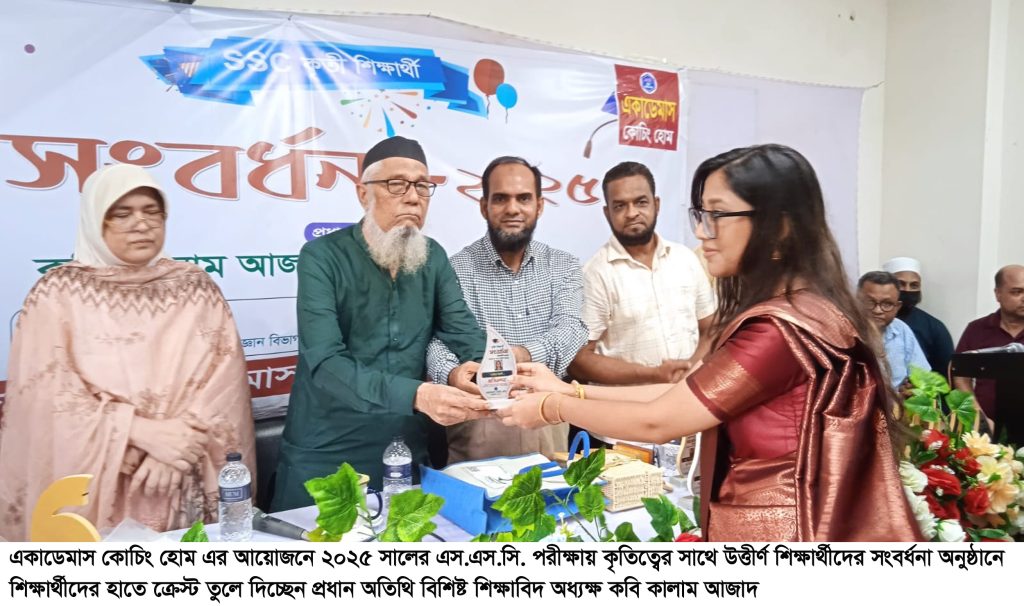 গতকাল শনিবার ১৯ জুলাই সিলেট শহরের মেজরটিলাস্থ সিদ্দিকী প্লাজায় অবস্থিত একাডেমাস কোচিং হোম এর আয়োজনে ২০২৫ সালের এস.এস.সি. পরীক্ষায় কৃতিত্বের সাথে উত্তীর্ণ জিপিএ-৫ প্রাপ্ত ও অন্যান্য শিক্ষার্থীদের সংবর্ধনা অনুষ্ঠানে প্রধান অতিথি’র বক্তব্যে বিশিষ্ট শিক্ষাবিদ অধ্যক্ষ কবি কালাম আজাদ একথা বলেন।