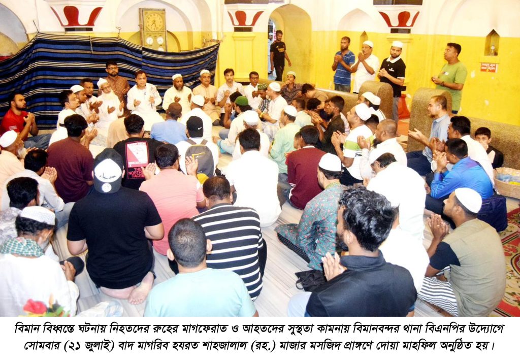 ডেস্ক নিউজ:: বিমান বিধ্বস্তে ঘটনায় নিহতদের রুহের মাগফেরাত ও আহতদের সুস্থতা কামনায় বিমানবন্দর থানা বিএনপির উদ্যোগে সোমবার (২১ জুলাই) বাদ মাগরিব হযরত শাহজালাল (রহ.) মাজার মসজিদ প্রাঙ্গণে দোয়া মাহফিল অনুষ্ঠিত হয়।