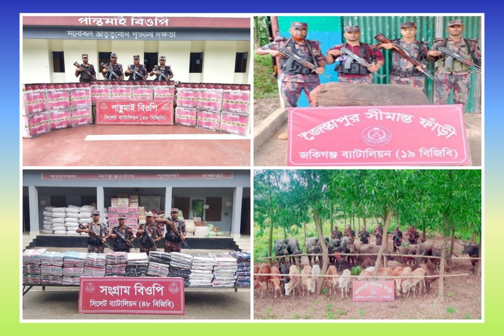 বিজিবি সূত্রে জানা গেছে, গোপন সংবাদের ভিত্তিতে পরিচালিত পৃথক অভিযানে সিলেট ও সুনামগঞ্জের প্রতাপপুর, সংগ্রাম, পান্থুমাই, তামাবিল, সোনারহাট, কালাইরাগ, বাংলাবাজার, গুয়াবাড়ী, কানাইঘাট এবং জৈন্তাপুর সীমান্ত এলাকায় অভিযান চালানো হয়।
