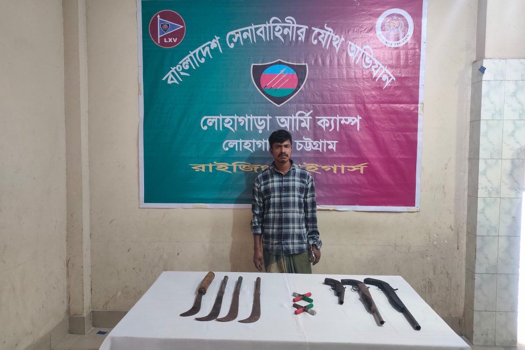 আটককৃত মোহাম্মদ নুরুল আমিনকে জিজ্ঞাসাবাদের পর লোহাগাড়া বড়হাতিয়া ইউনিয়ন এর (৮নং)ওয়ার্ডস্হ চাকফিরানি আশ্রায়ন প্রকল্প সংলগ্ন একটি পরিত্যাক্ত টিনের বাড়ি হতে তল্লাশি চালিয়ে এক নালা এলজি ৩টি, কার্তুজ ও ৪টি দেশীয় তৈরি তৈরি রামদা উদ্ধার করা হয়।