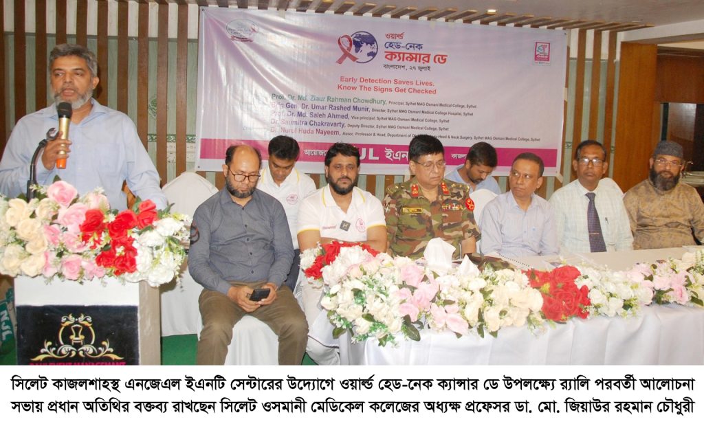 বুধবার (৩০ জুলাই) দুপুরে সিলেট কাজলশাহস্থ এনজেএল ইএনটি সেন্টারের উদ্যোগে ওয়ার্ল্ড হেড-নেক ক্যান্সার ডে উপলক্ষ্যে বর্নাঢ্য এক র্যালি শেষে স্থানীয় এক হোটেলে আয়োজিত হেড-নেক ক্যান্সার বিষয়ক সেমিনারে প্রধান অতিথির বক্তব্যে তিনি উপরোক্ত কথাগুলো বলেন। র্যালিটি সিলেটের চৌহাট্টাস্থ কেন্দ্রীয় শহীদ মিনার থেকে যাত্রা শুরু করে জিন্দাবাজার রোড ঘুরে জেল রোডে এসে শেষ হয়। সেমিনারের শুরুতে বৈজ্ঞানিক প্রবনু উপস্থাপন করেন ডা. নুরুল হুদা নাঈম বলেন, বেশিরভাগ হেড-নেক ক্যান্সার প্রতিরোধ যোগ্য এবং প্রতিরোধের জন্য সচেতনতার বিকল্প নেই। আর জনসচেতনতা বৃদ্ধির লক্ষে আমাদের এ আয়োজন।