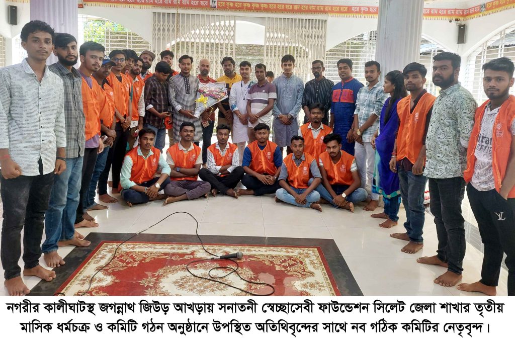 সনাতনী স্বেচ্ছাসেবী ফাউন্ডেশন সিলেট জেলা শাখার তৃতীয় মাসিক ধর্মচক্র ও কমিটি গঠন অনুষ্ঠান সম্পন্ন হয়েছে। শুক্রবার (১ আগস্ট) সকাল ১১টায় সিলেট নগরীর কালীঘাটস্থ জগন্নাথ জিউড় আখড়ায় এই অনুষ্ঠানের আয়োজন করা হয়।