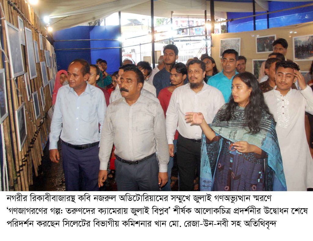 এরপর বিকেল ৫টায় নগরীর রিকাবীবাজারস্থ কবি নজরুল অডিটোরিয়ামের সম্মুখে ‘গণজাগরণের গল্প: তরুণদের ক্যামেরায় জুলাই বিপ্লব’ শীর্ষক আলোকচিত্র প্রদর্শনীর উদ্বোধন করেন সিলেটের বিভাগীয় কমিশনার খান মো. রেজা-উন-নবী সহ অতিথিবৃন্দ।