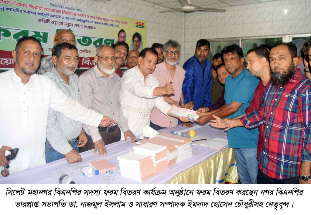 সিলেট মহানগর বিএনপির সদস্য ফরম বিতরণ কার্যক্রম অনুষ্ঠিত হয়েছে। রোববার (৩ আগস্ট) নগরীর সোবহানীঘাটস্থ একটি কমিনিউটি সেন্টারে মহানগর বিএনপির ভারপ্রাপ্ত সভাপতি ডা. নাজমুল ইসলামের সভাপতিত্বে ও সাধারণ সম্পাদক ইমদাদ হোসেন চৌধুরীর পরিচালনায় সদস্য ফরম বিতরণ অনুষ্ঠান অনুষ্ঠিত হয়।